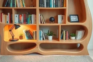 Если предполагается, что стеллажи полки будут открытым и станут главным акцентом интерьера, то стоит заказать мебель нестандартных видов (угловых) с поверхностями, изогнутыми под разными углами. Такая мебель изготавливается из дерева, разных цветных стекол, пластика. Шкафы могут иметь самые разнообразные конфигурации и полки. Органичнее всего стеллажи со стеклянной поверхностью выглядят в интерьерах, выдержанных в современном стиле или арт-деко.
