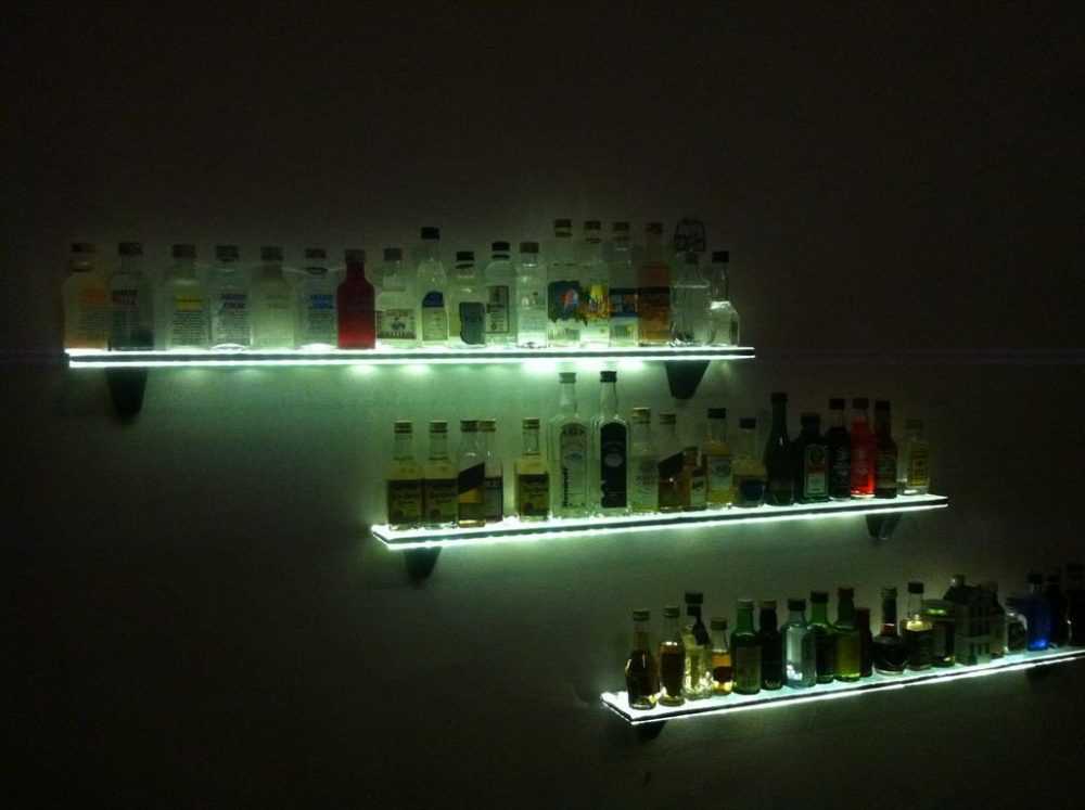 Барные полки для бутылок могут выглядеть совершенно просто, но создавать незабываемый антураж. Барная вариация представляет собой узкий деревянный ящик, в котором устанавливается несколько бутылок. Конструкции могут быть открытого типа, что позволяет любоваться игрой стекла и напитка в свете ламп. Используя прием баров и ресторанов, полки часто обустраивают зеркалом. Это визуально увеличивает ассортимент, который представлен всего несколькими бутылками. Барные полки часто оснащены дополнительными отверстиями для размещения бокалов.