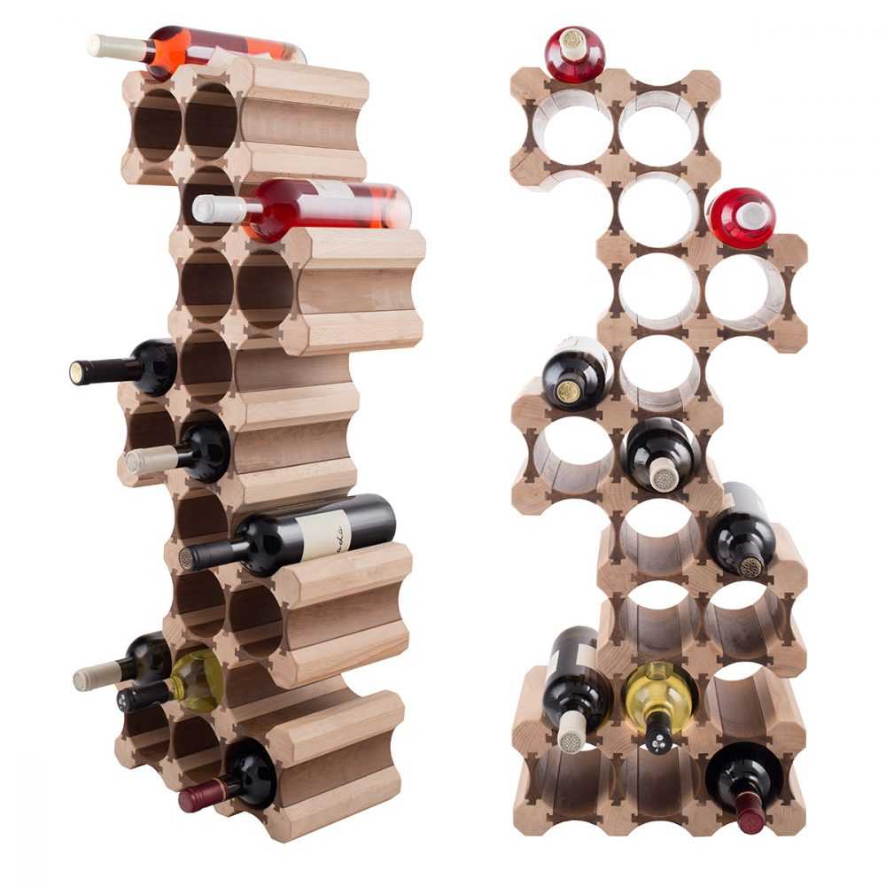 Винный стеллаж или подставка для бутылок, по сути, является домашней витриной, которая поможет сделать правильный выбор и полюбоваться разнообразием напитка. Конструкция очень напоминает винный шкаф, но без дверей. Бывают напольные и настенные изделия. При этом разделители для наполненных емкостей формируют интересные фигуры. Дополнительно стеллаж для винных бутылок может обустраиваться легкой подсветкой, что создает таинственную и одновременно романтичную атмосферу. В комплекте могут иметь полки под бокалы, штопор и для личных вещей, например, книг и статуэток. Выставляются такие приспособления на видном месте, чтобы гости могли полюбоваться красотой игристого напитка.