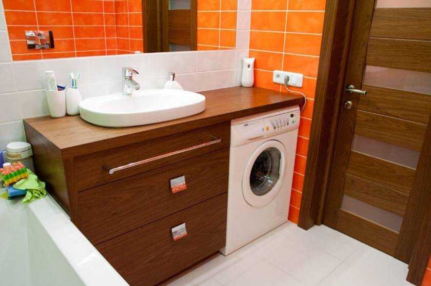 - Правильная расстановка бытовых предметов. Лучшее место как для машинки, так для раковины с точки зрения удобства – ванная комната. Здесь все предназначено для гигиенических процедур и стирки, в отличие от других помещений в доме, которые нужно адаптировать под данные процессы.