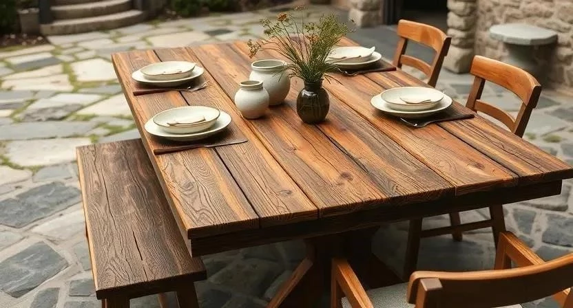 - Деревянные столы: Классика дачного стиля. Экологичны, красивы, но требуют регулярной обработки для защиты от влаги и солнца.