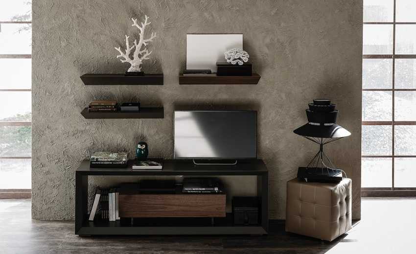 - удачно подобранная мебель под телевизор подчёркивает эффектность телевизионной техники, дополняя модный интерьер помещения;