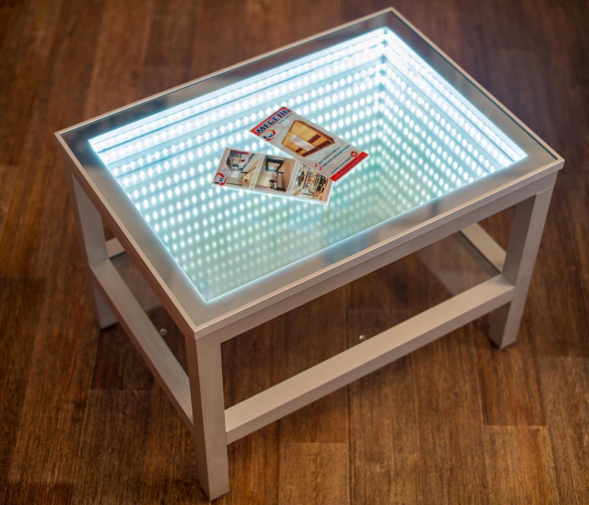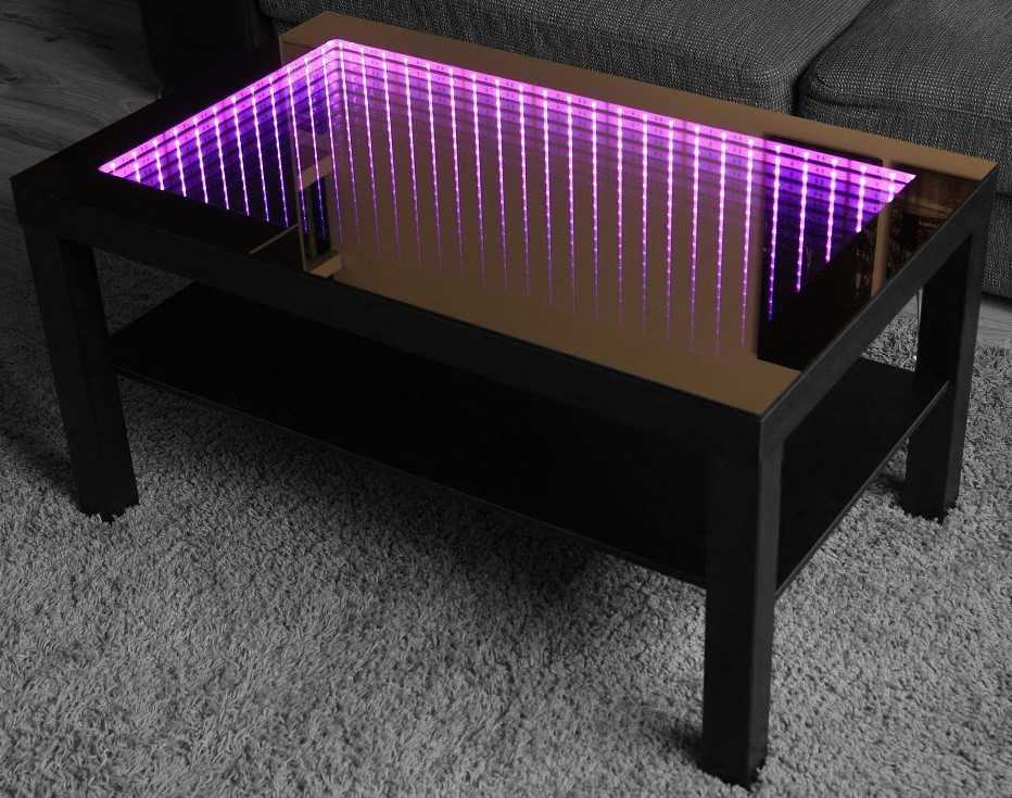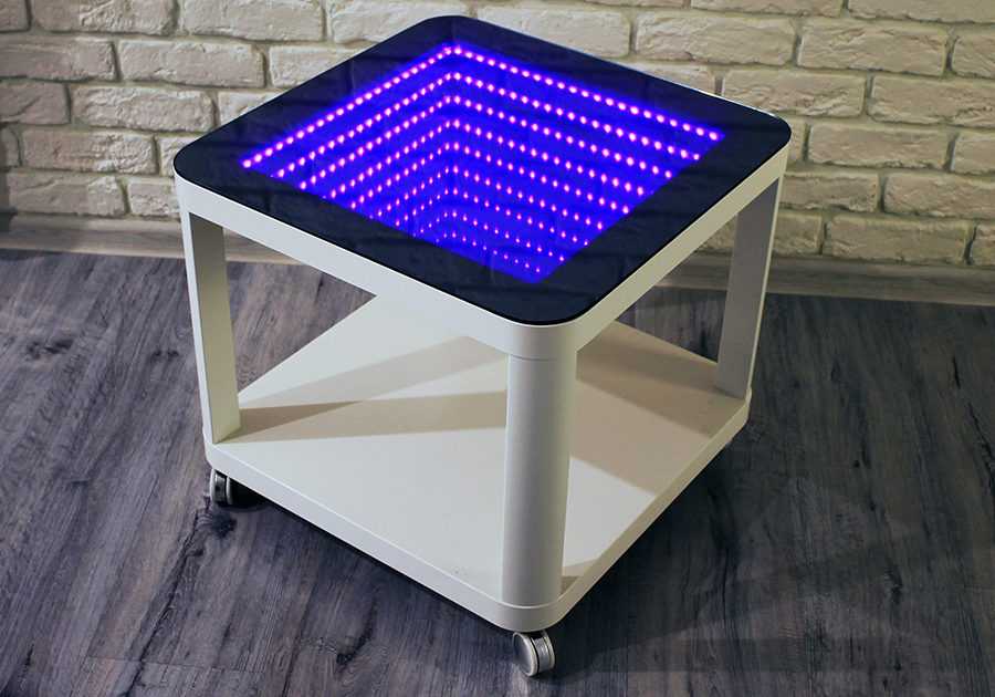 При изготовлении столика используется светодиодная лента, которая и создает эффект бесконечности.