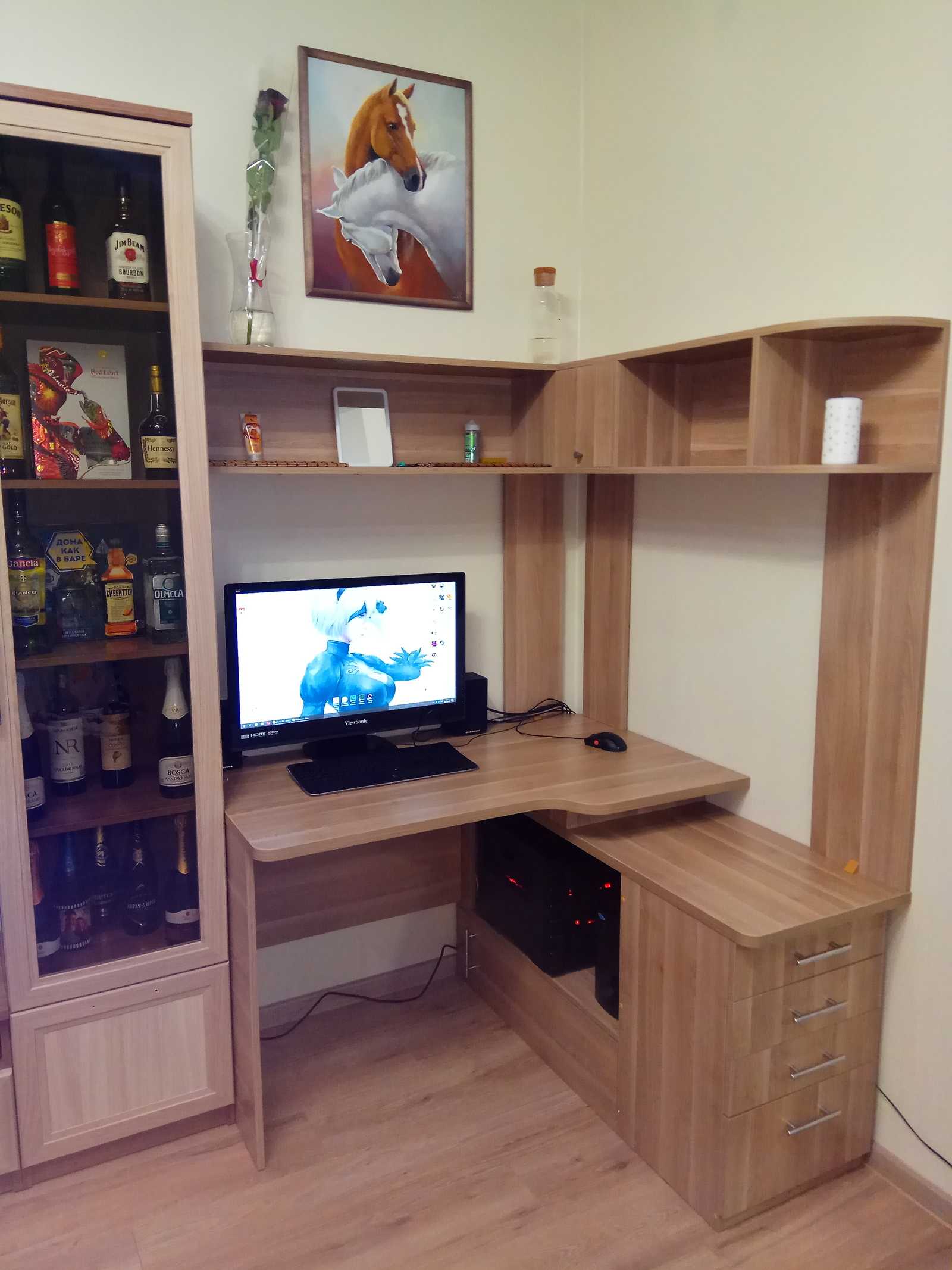 Их ширина должна быть равной ширине стола, высота 160-180 см. На этой высоте можно расположить 1 или 2 полки для мелких вещей. Внизу отводится место под системный блок. Для удобства можно расположить пару ящиков или полок.