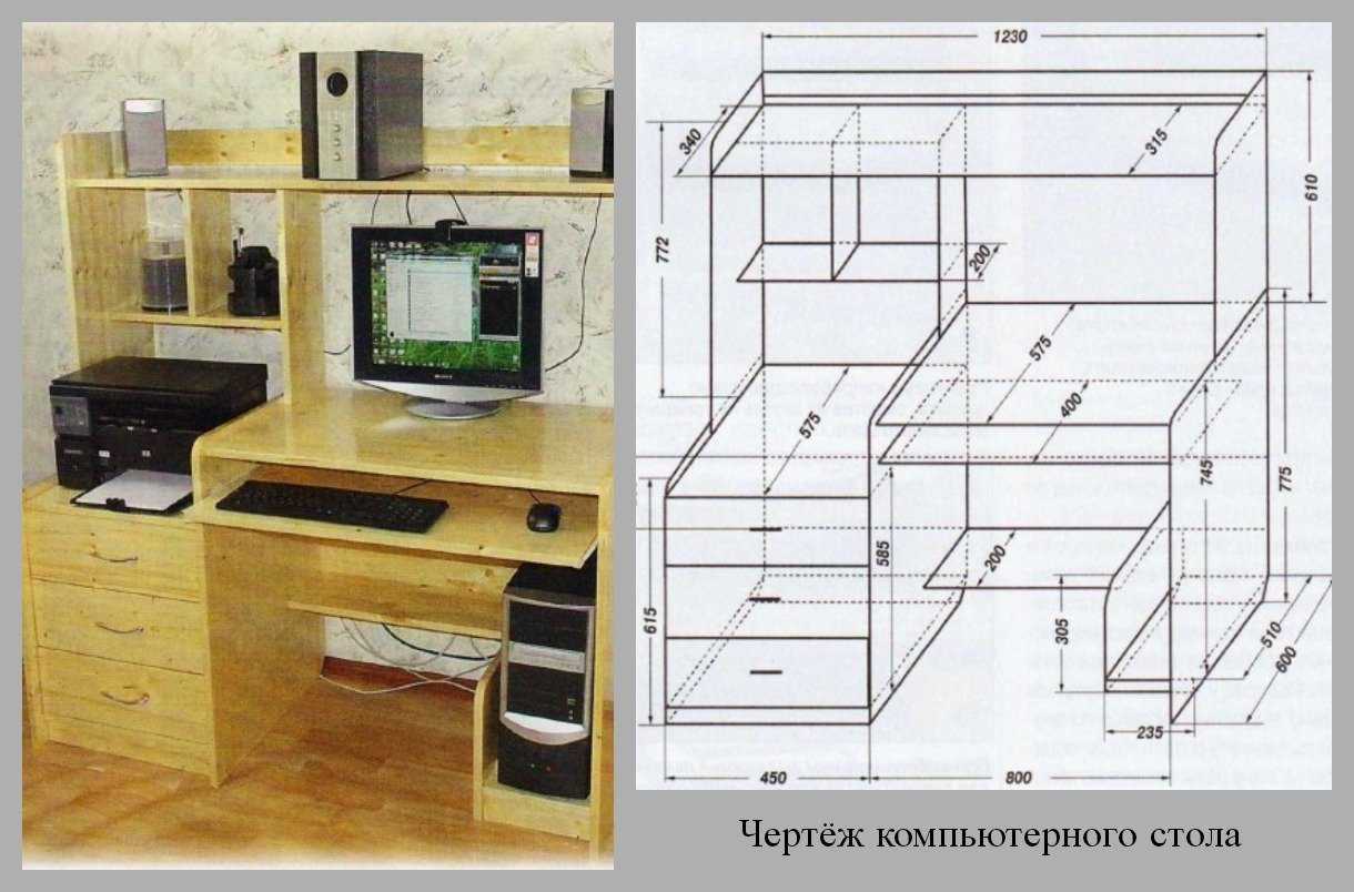 При возникновении вопроса как сделать компьютерный стол своими руками в домашних условиях, стоит прежде всего задуматься о видах этих изделий. Это поможет выбрать общий проект и создать качественные чертежи, что существенно упростит работу. По ним впоследствии будут раскраиваться детали.
