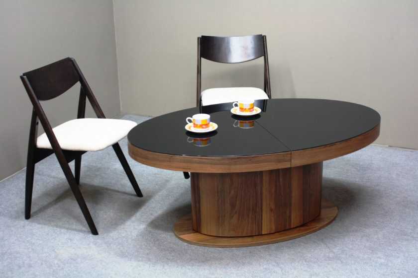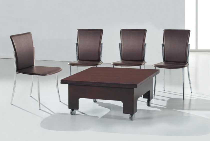 - Обеденно-журнальный. Модель признается самым распространенным столом-трансформером. В сложенном состоянии изделие неприметно и не занимает много места. В обычные дни оно используется как журнальный столик, а при необходимости конструкцию можно разложить в комфортный, полноценный обеденный стол. Всего несколько движений, и за ним смогут с удобством разместиться 5–7 человек.