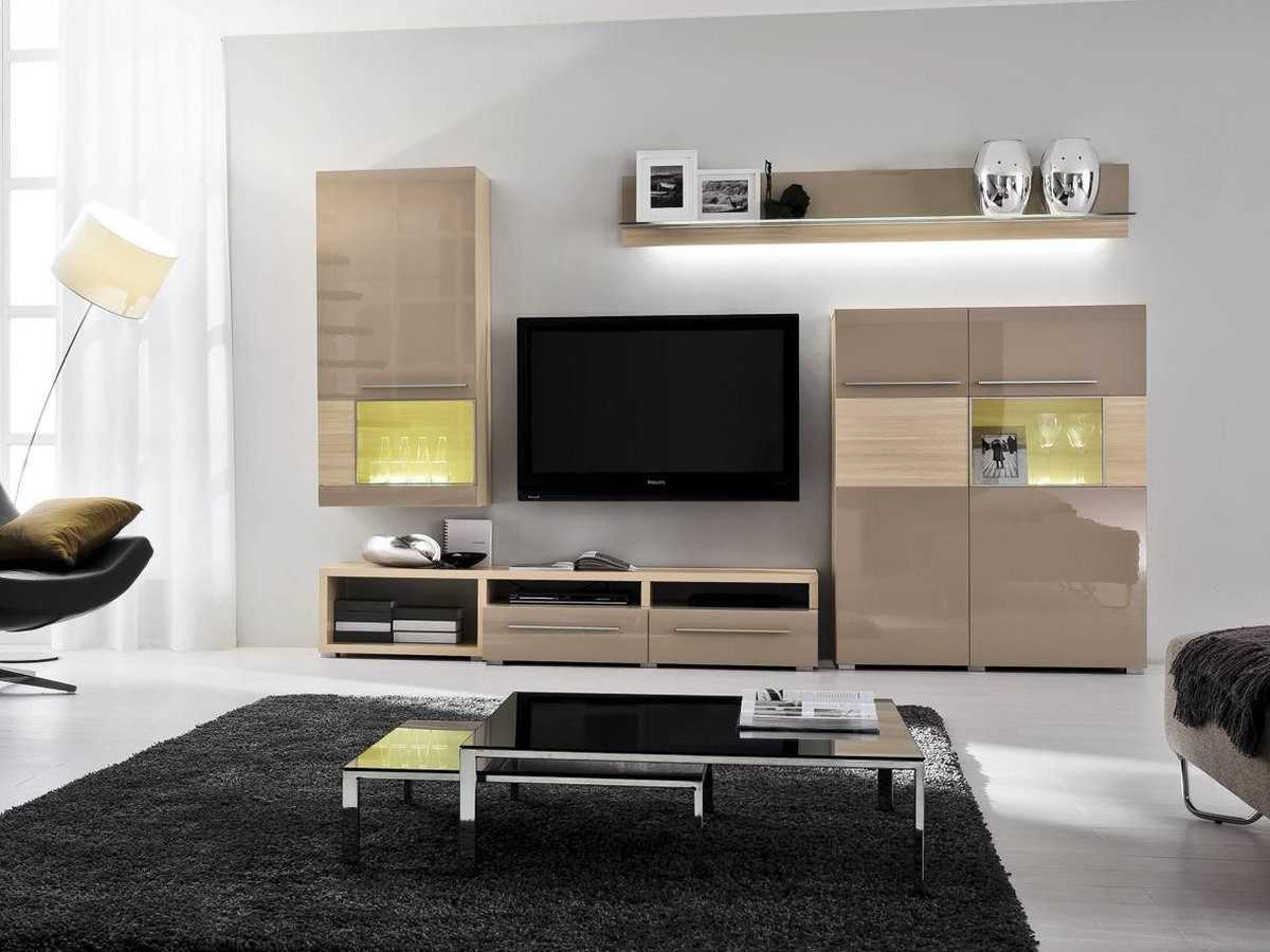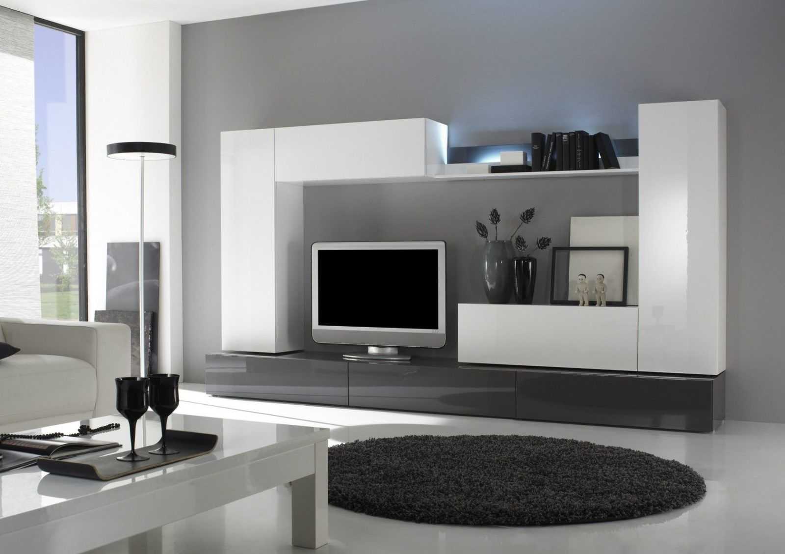 Оснащенность интерьера новинками техники и функциональных мебельных предметов представлена комфортабельным трансформирующимся или модульным диваном в дуэте с журнальным столиком со стеклянной круглой столешницей, расположенными перед висящим на стеновой глади большим телевизионным монитором. Корпусные предметы имеют гладкие фасады, очень ценится модульная мебель, позволяющая создавать уникальные композиции.