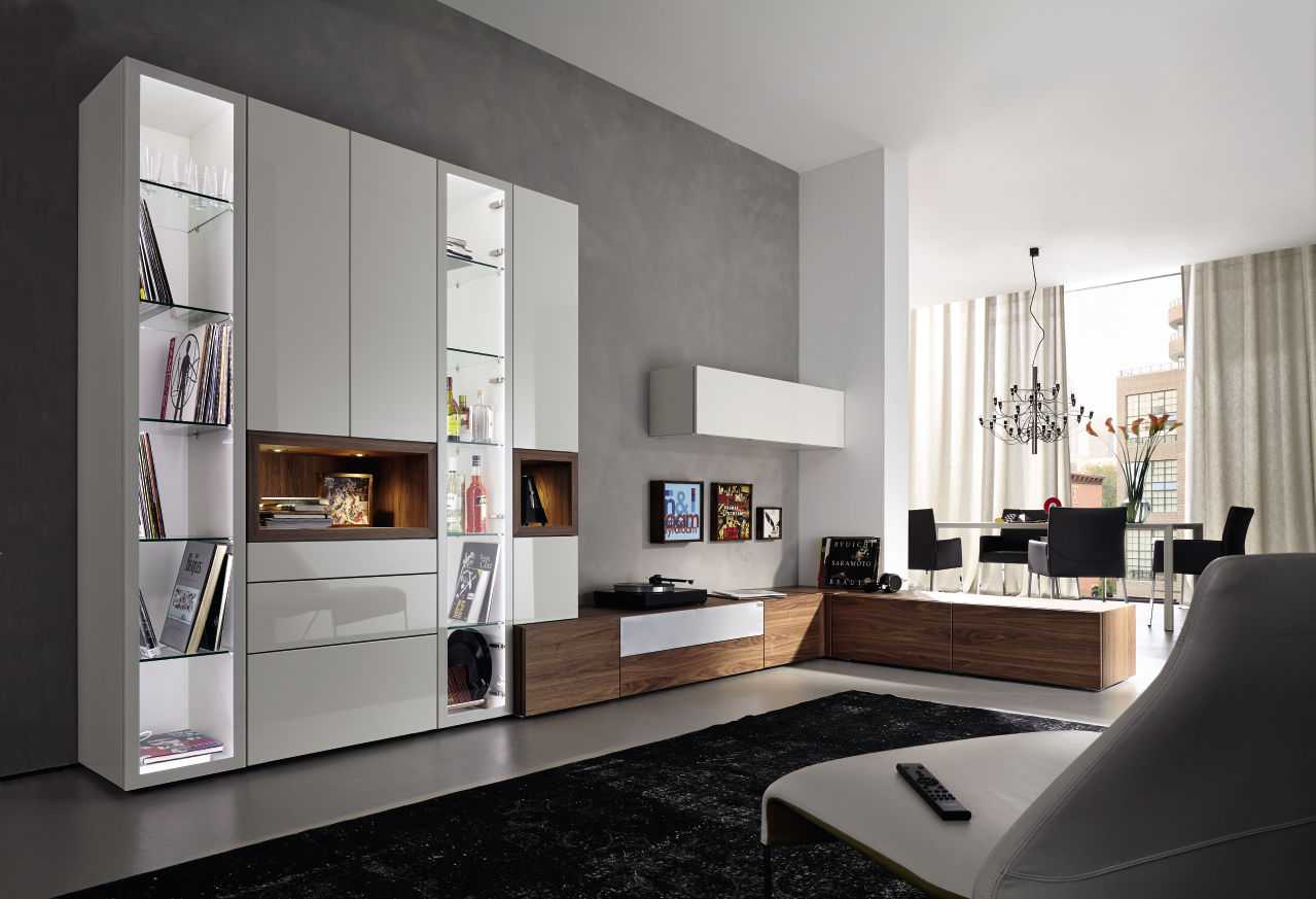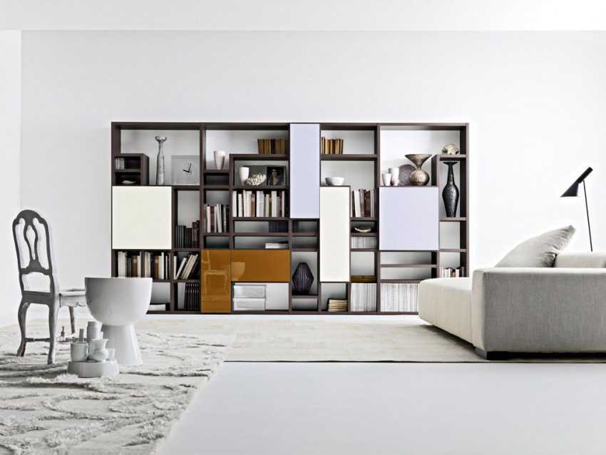 Открытые стеллажные конструкции используются для хранения книг и приятных декоративных предметов. Часть вещей можно скрыть за стеклянными гладкими витринами, а остальные скрыть за гладкими фасадами шкафов.