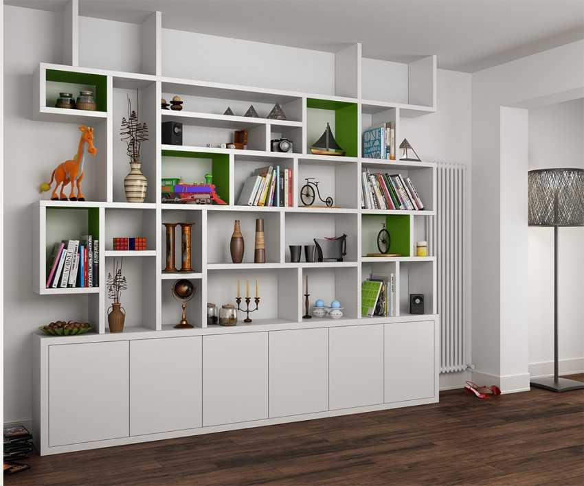 Нередко системы хранения используются в современной интерьерной композиции в роли межкомнатных перегородок.