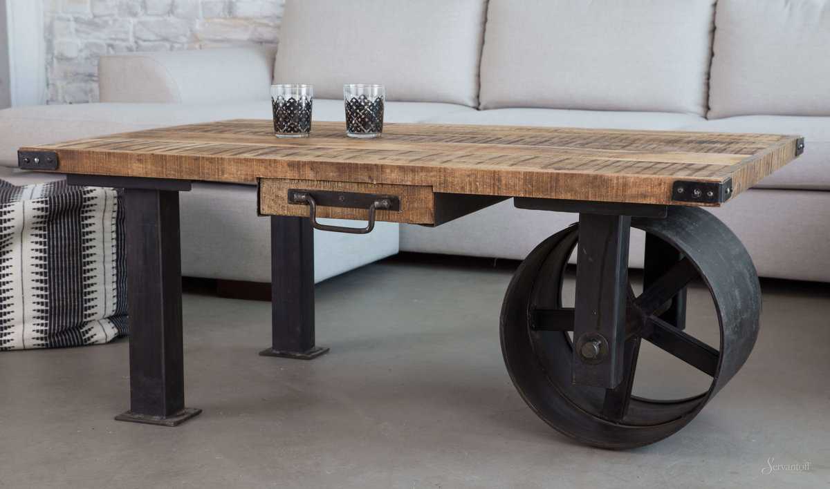 Для данного стиля типичен нестандартный подход в выборе материалов. Колеса в таком случае не всегда имеют декоративное значение. Зачастую столы с металлическими элементами имеют внушительный вес и низкую степень мобильности. Постановка их на колеса в некоторой степени снимает эту проблему.