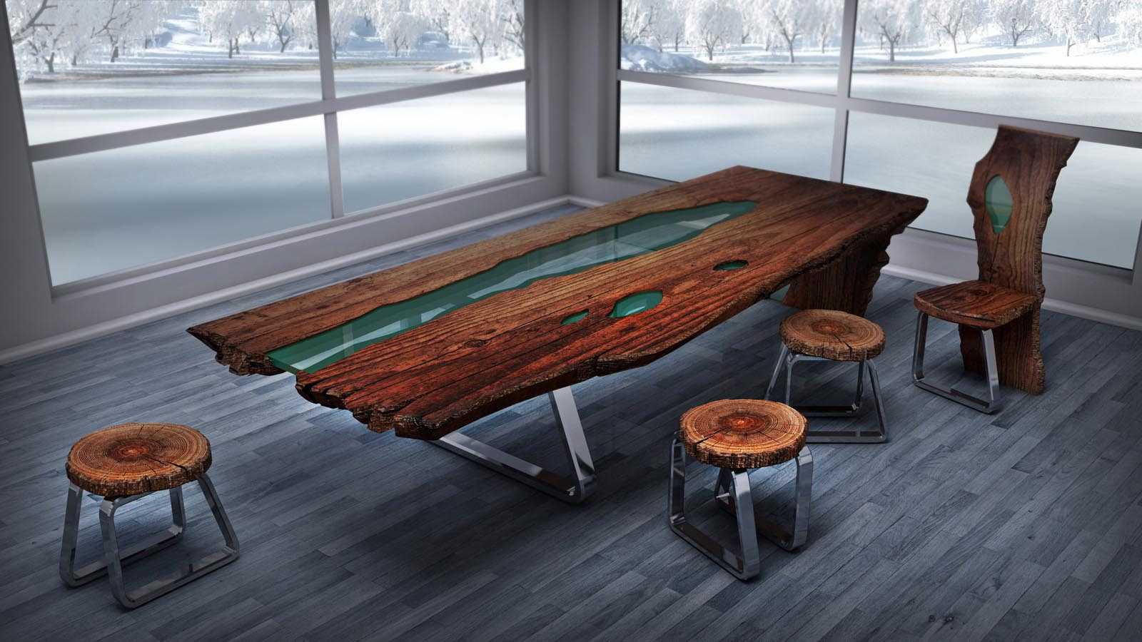 С помощью эпоксидной смолы, получается добиться ощущения, как будто посреди столешницы протекает ручей. Иногда для большего эффекта раствор смолы наполняют фосфорными красками самых различных цветов, чтобы данные изделия с вставками с неровными краями, приобретали шедевральный облик.