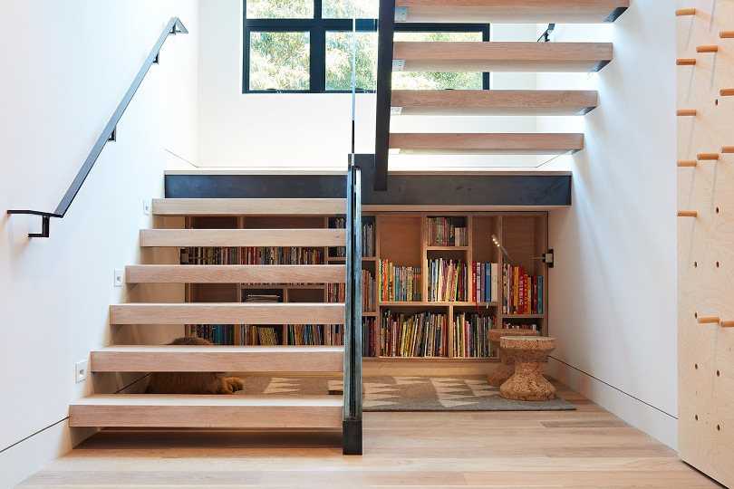 Стеллаж под лестницей можно разместить вглубь на половину или одну треть. Также полки можно установить с боковой или обратной стороны лестницы.