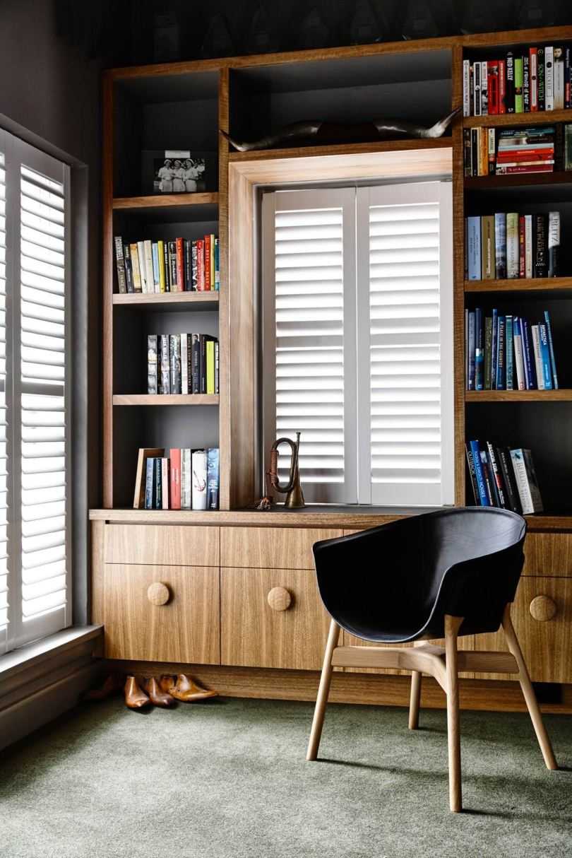 Пространство между окнами можно сделать дополнительным местом для хранения и заполнить его стеллажами.