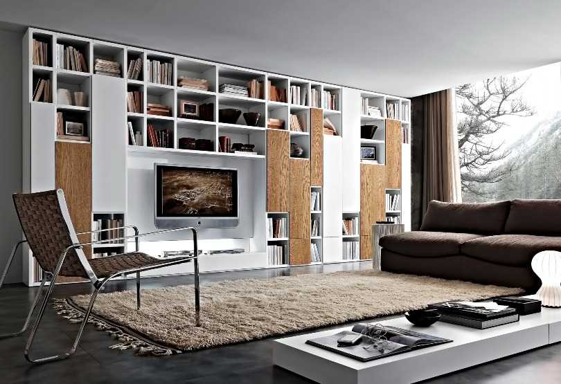 Во многих стеллажах, которые размещаются по всей стене, предусмотрено место под телевизор.