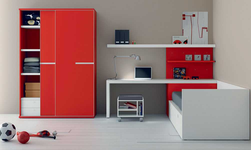 Набор для подростковой комнаты с зоной отдыха, имеет большое количество, весьма вместительных, ящичков и полок под гаджеты. В состав входят также платяные шкафчики с множеством отделений. По желанию прозрачные поверхности можно заменить матовым стеклом.