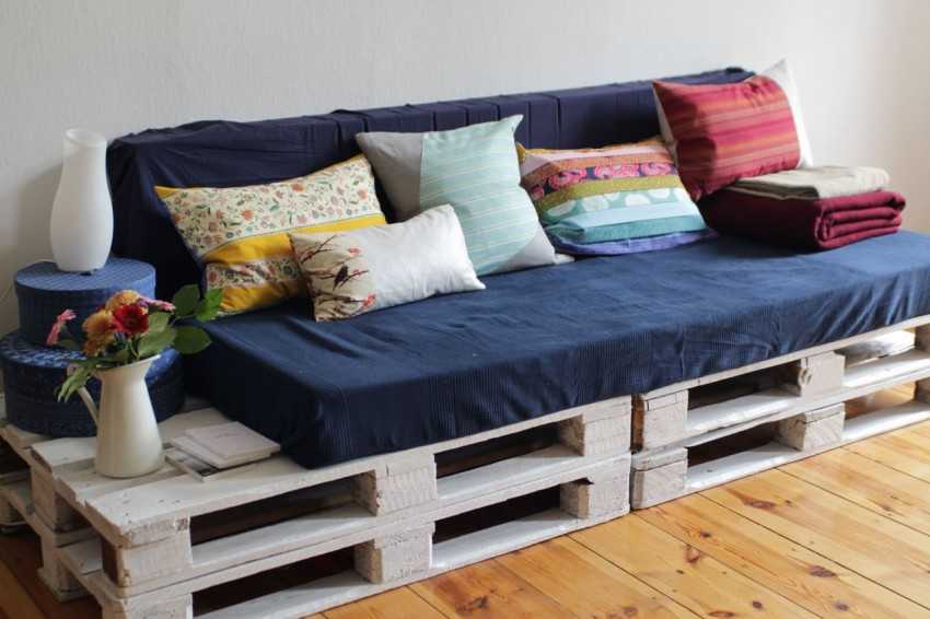 Совет. Некоторые изготавливают данный предмет мебели из европоддонов, старых досок и стульев, отживших свой век межкомнатных дверей, толстого бруса, покрышек, но такой «грубый» диван подойдет не к каждому интерьеру.