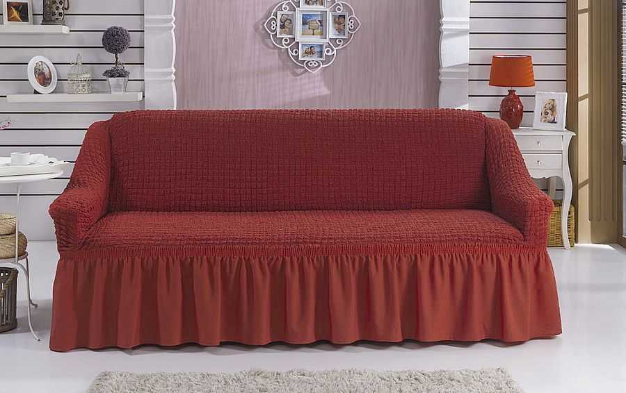 - Чехлы на резинке легко натягиваются на диван и фиксируются благодаря вшитой резинке. Это покрытие легко изготовить самостоятельно даже без выкройки.