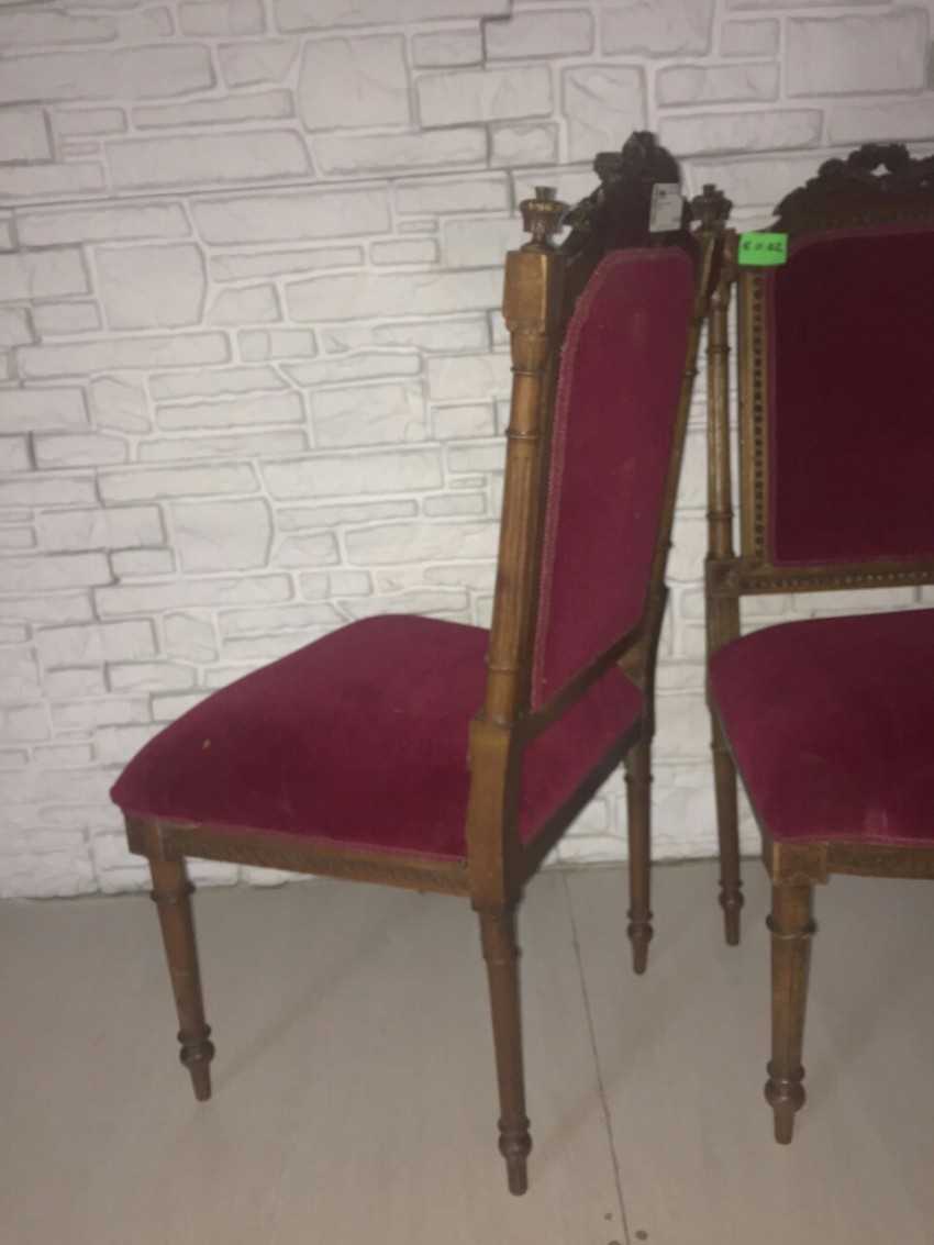 - Классицизм. Стулья приобретают строгие формы, исчезает округлость и мягкость. Деревянные элементы преимущественно темного цвета покрывают резьбой и позолотой. Приоритетные оттенки обивочной ткани: белый и золотой.