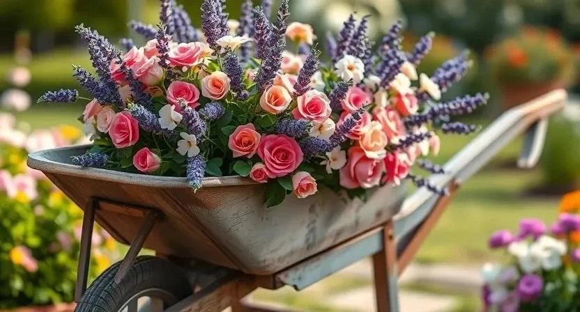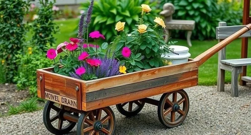 - Клумбы из старых тележек, придающие саду деревенский шарм.