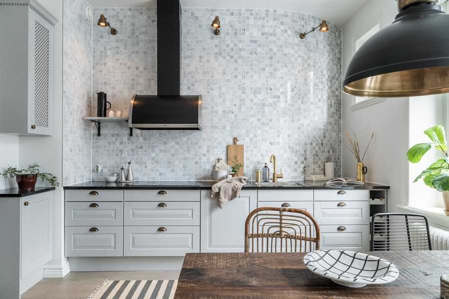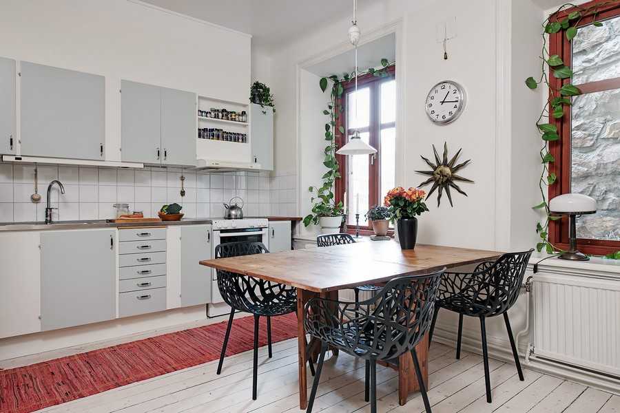 Для небольшой кухни вряд ли подойдет помпезное оформление а-ля 30-е или яркий пин-ап 50-х, но советская «оттепель» или гранж станут отличным решением. Придерживайтесь светлой цветовой гаммы, чтобы расширить помещение визуально.