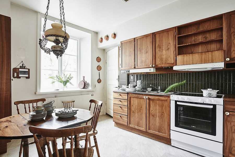 Тем, кто ностальгирует по СССР, подойдет идея оформления в стиле 60-х. Обои с ярким узором, разномастная мебель вместо кухонного гарнитура, линолеум, керамический фартук в рабочей зоне, подвесной светильник с крупным плафоном. Изюминкой интерьера станет застекленный шкаф-буфет для хранения посуды.