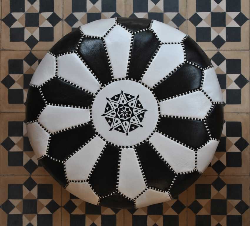 - пуфик с графическим рисунком — внешне напоминающий лоскутное одеяло, подходит для гостиных помещений загородных домов, если поставить его около камина;