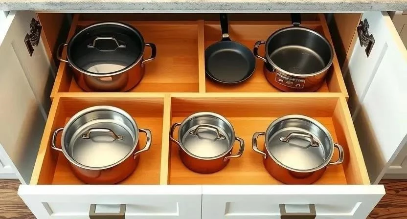 Существует множество типов выдвижных ящиков, предназначенных для различных целей. Для посуды подойдут ящики с разделителями, предотвращающими сколы и царапины. Для столовых приборов – ящики с ложементами, обеспечивающими четкое расположение каждого предмета. Ящики для кастрюль и сковородок должны быть достаточно глубокими и прочными, чтобы выдерживать вес тяжелой посуды. Для специй – узкие ящики с наклонным дном, обеспечивающим хороший обзор содержимого. Материалы изготовления ящиков могут быть разными: ЛДСП, МДФ, массив дерева. Фурнитура играет важную роль – качественные направляющие обеспечивают плавное и бесшумное выдвижение.
