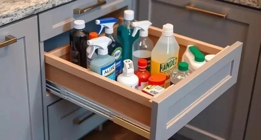 В цоколе можно разместить выдвижные ящики для хранения редко используемых предметов, таких как сезонная посуда или праздничная сервировка. Также в цоколе можно организовать хранение бытовой химии.