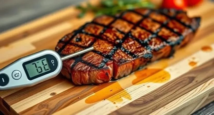 - Когда температура достигнет желаемого значения, снимите стейк с огня и дайте ему отдохнуть несколько минут.