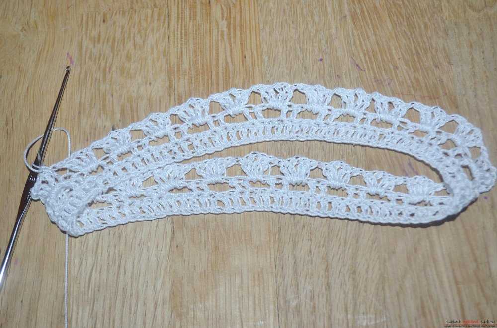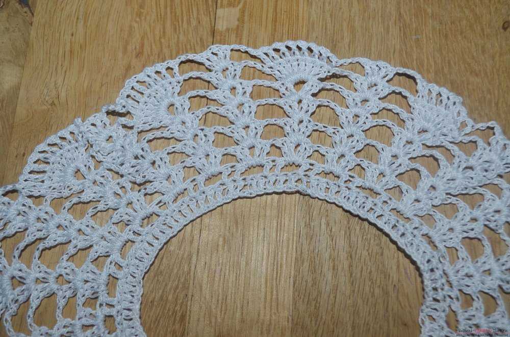 9) Когда абажур будем нужного размера, последний ряд вкруговую обвяжем веерками, таким образом: 1 столбец без накида – 5 столбцов с одним накидом – 1 столбец без накида. По завершении работы изделие обязательно необходимо намочить водой и равномерно потянуть во все стороны, чтобы петельки разровнялись и стали одинаковыми. Кроме того будущий абажур можно слегка накрахмалить.