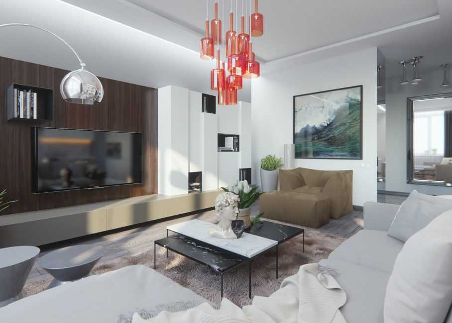 Светильники в интерьере гостиной могут выглядеть несколько простовато и однообразно. Популярными моделями становятся обычные лампы на проводах.