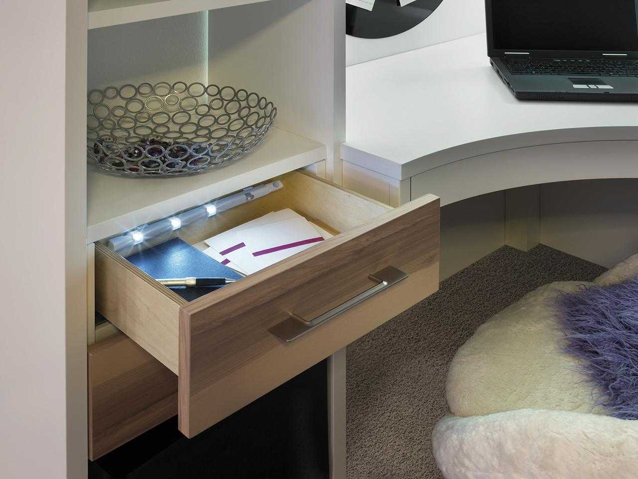 Если встраиваемые приборы требуют подготовки поверхности для монтажа (сверление отверстий), то накладные аналоги для мебели просто крепятся к торцам полок и прочих предметов интерьера.