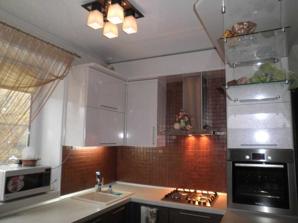 Визуально расширить помещение поможет и сам потолок. Чтобы увеличить «рост» кухни, рекомендуют устанавливать натяжные потолки с глянцевым покрытием. Отраженная в них лампа будет зрительно умножаться, создавая интересные блики. Конечно же, потолок с «отражающим подтекстом» должен быть белоснежным.