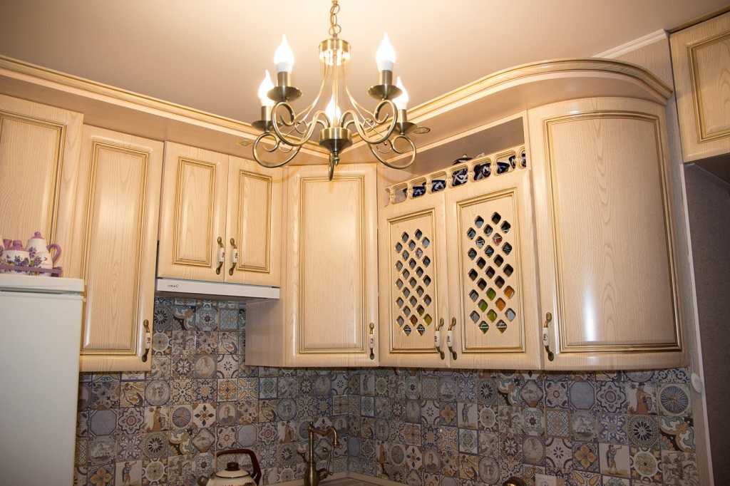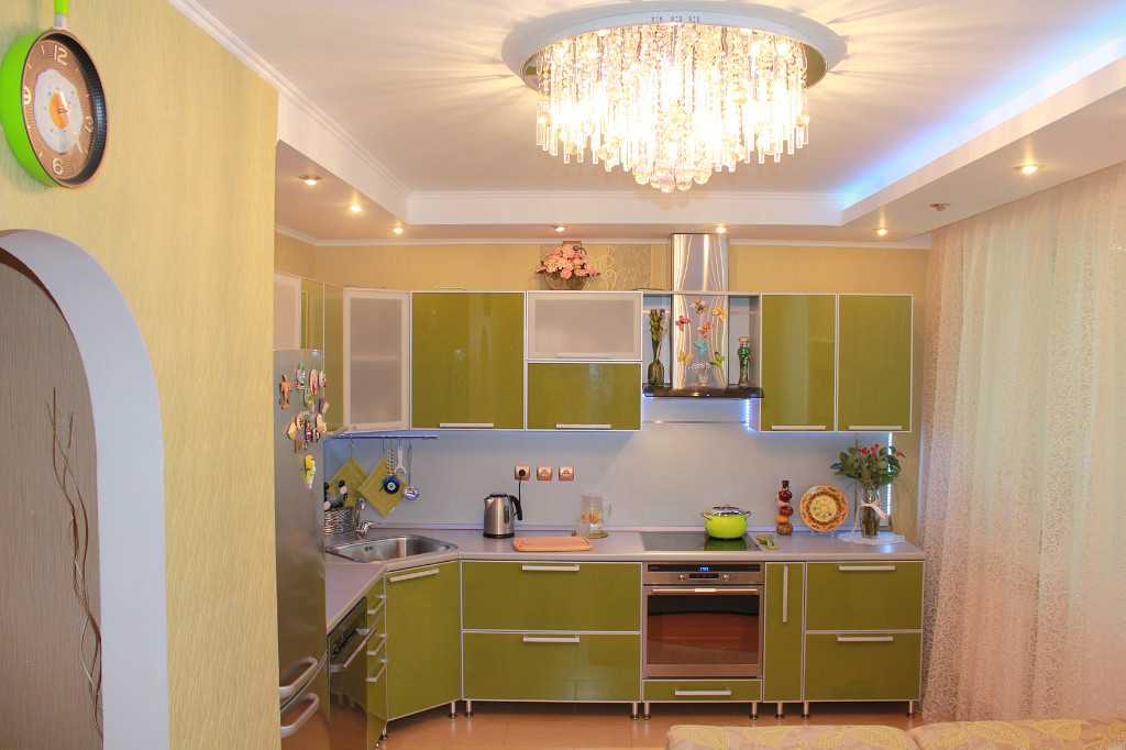 Чтобы маленькая кухня смотрелась гармонично и не была перегружена осветительным оборудованием, внимание лучше обратить на высокие потолочные люстры. Подвесные варианты и другие громоздкие приборы будут неуместны, а припотолочное освещение еще больше сузит крохотное пространство