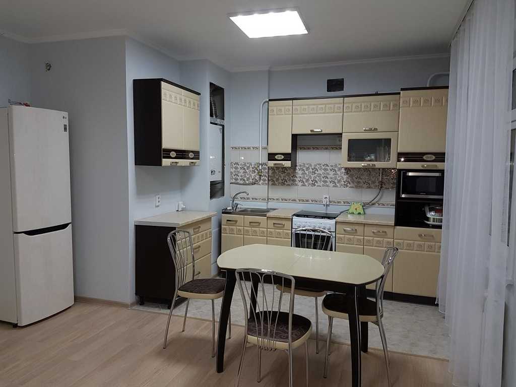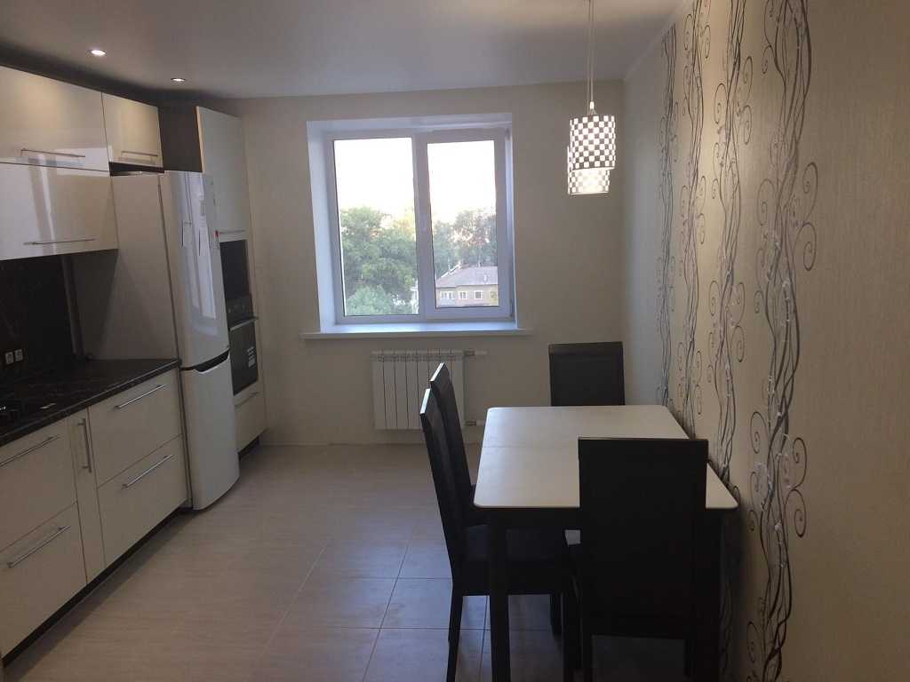 На фото интерьер кухни в квартире с двумя люстрами на потолке над обеденной группой.