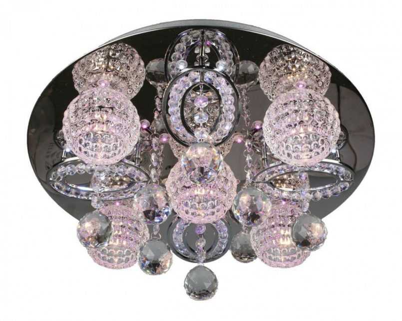 Замыкает рейтинг модель, при изготовлении которой использовали несколько видов материалов. Диаметр люстры составляет 739 мм. Небольшая высота и крепление на планку позволяет устанавливать ее в комнаты с низкими потолками. Арматура хромированная, глянцевая.