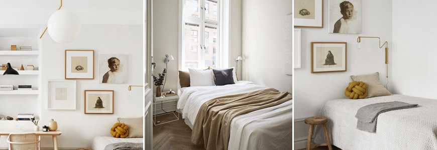 Шведы и датчане специалисты по созданию уюта в спальнях. Применяются льняные ткани, шерстяные покрывала, декоративные подушки приглушенных оттенков. В спальнях размещают прикроватные настенные светильники натуральных цветов (латунь, алюминий), настольные лампы и потолочные светильники.