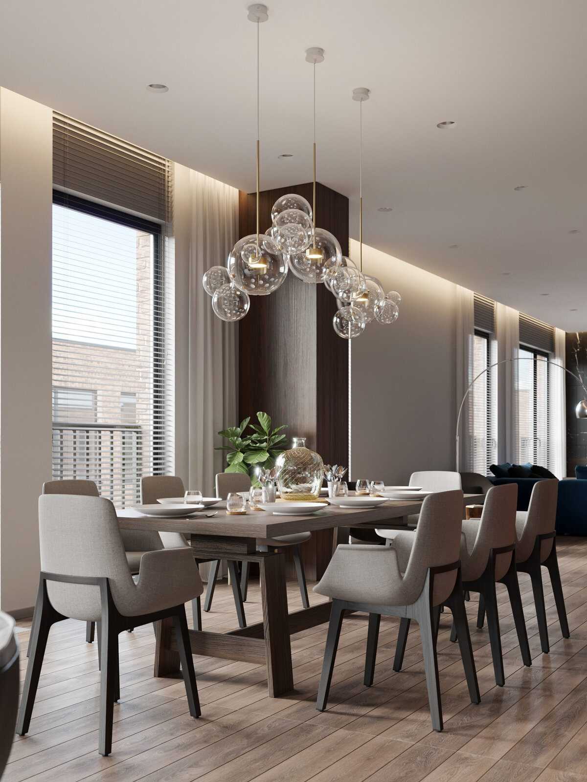 Даже недавно построенные современные пространства с минимальной мебелировкой являются ключевыми: простой стол, стулья в стиле swan (лебедь) смягчены акцентами светлого дерева и богатыми оттенками кожи коньячного цвета. Два простых светильника разного размера из дутого белого стекла на подвесах (Louis Poulsen, VL45), делают интерьер оригинальнее, и выделают нужную зону интерьера.