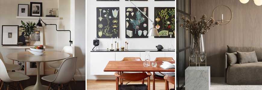 Цветное искусство (картины) редко встречается в скандинавских интерьерах. Но может быть группа картин, дополненная зеленью в простой вазе и контрастный светильник в промышленном стиле (DCW Edition). Отличительной чертой стиля Хюгге стали свечи, часто в простых латунных подсвечниках. Подсвечник дополняет ваза на тонком латунном основании.