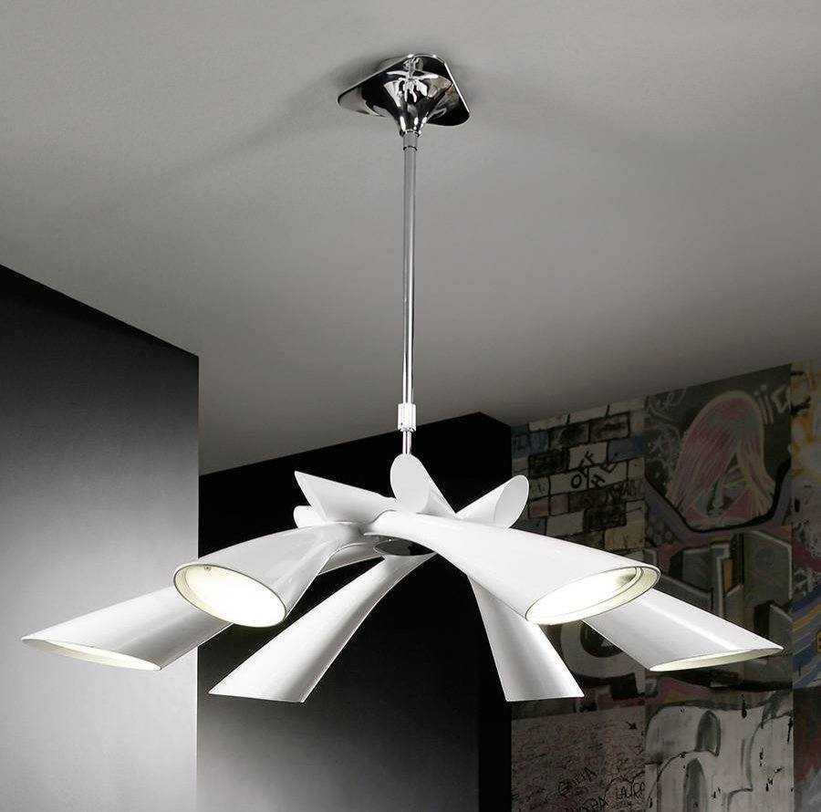Если же белый светильник хочется поселить в просторной кухне, предпочтение можно отдать раскидистой подвесной люстре.