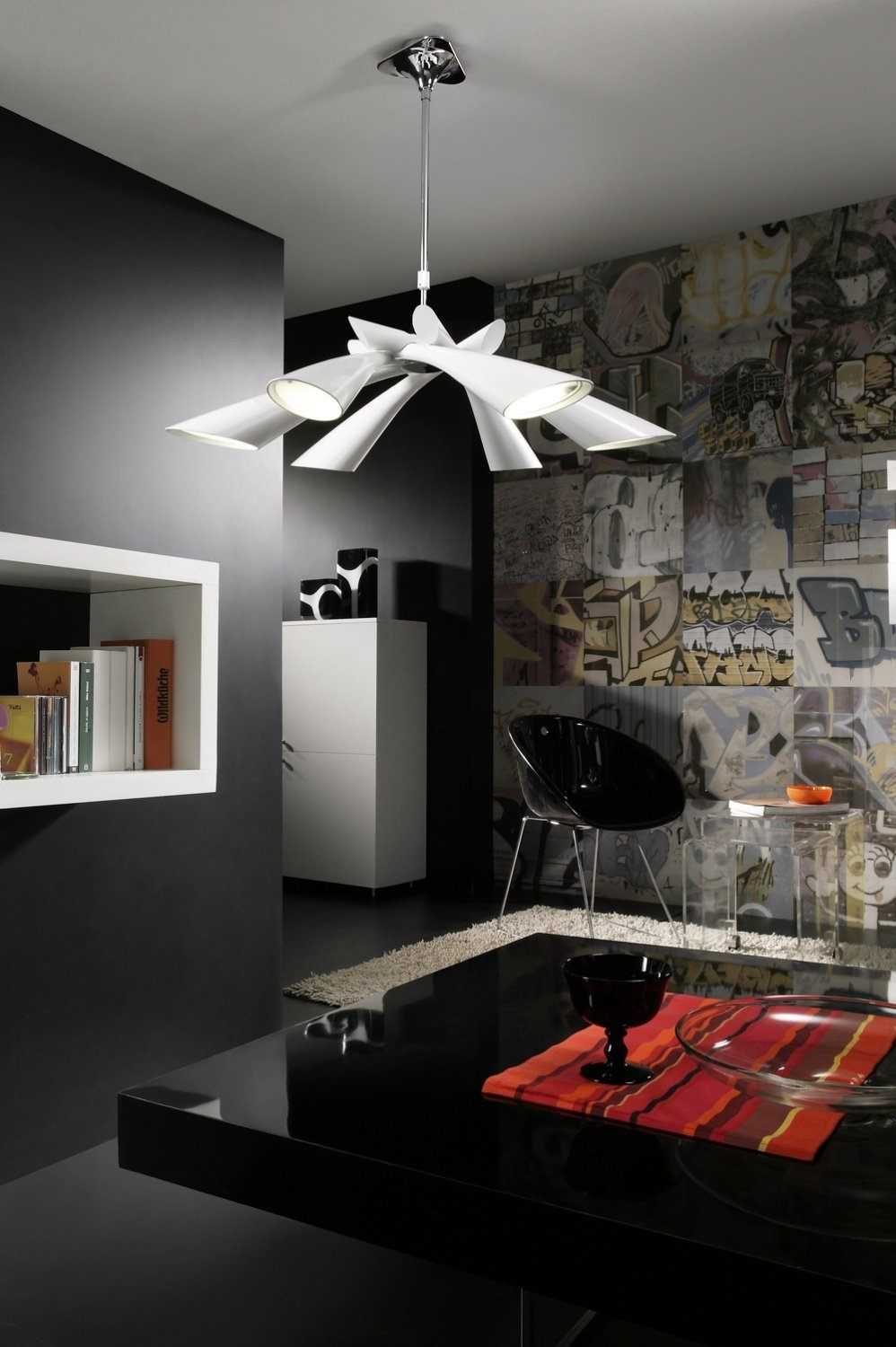 Современный стиль требует от черной люстры простоты и элегантности. Гармонично смотрится контраст цветов, где черная лампа станцует танго с белоснежным потолком. Впрочем, необязательно сочетать черную лампу именно с потолочным покрытием. Белыми могут оказаться любые поверхности. Столешницы, стулья или барная стойка. Главное, чтобы площадь белого цвета была значительно больше черного пятна люстры.