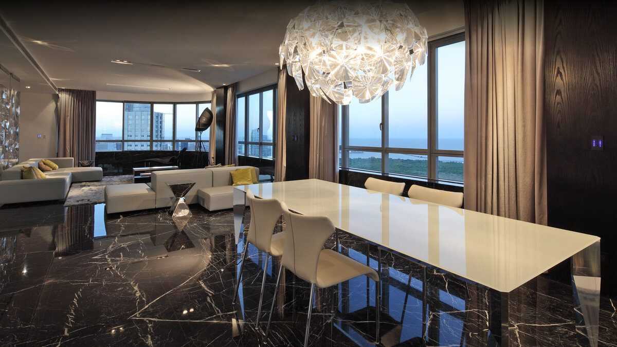 Дизайн интерьера строгий и элегантный. Каждая поверхность продумана до мельчайших подробностей. Предметы и покрытия излучают сияние и блеск.