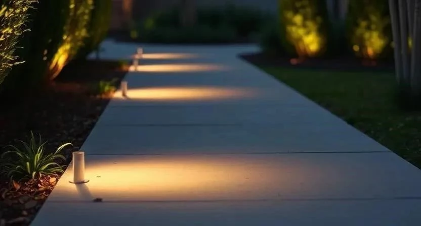 - Встроенные светильники: Монтируются в дорожки, террасы или газоны, создавая мягкое и рассеянное освещение.
