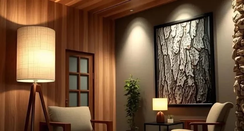 - Акцентный свет используется для выделения определенных объектов, например, фотографий деревьев, образцов коры или декоративных элементов.