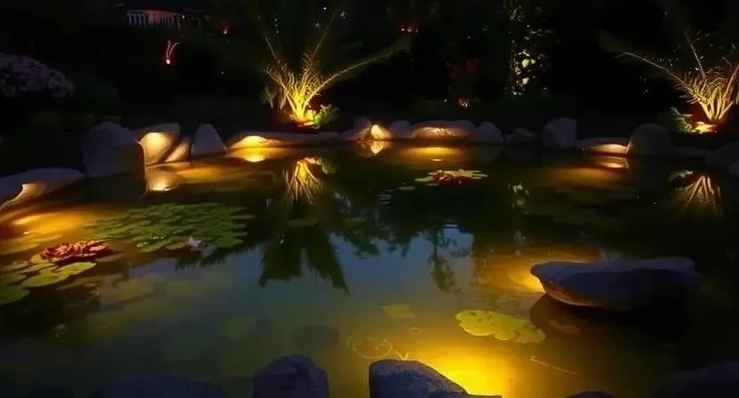 - Сочетание с ландшафтом: Освещение водоема должно гармонировать с общим стилем вашего сада. Для природного стиля подойдут светильники, имитирующие камни или плавающие лотосы. Для современного – минималистичные столбики и встраиваемые светильники.