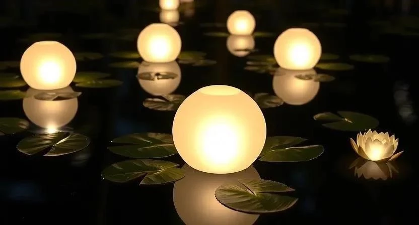 - Плавающее освещение: Светильники, которые держатся на поверхности воды. Создают динамичные световые пятна, отражения, могут быть автономными на солнечных батареях.
