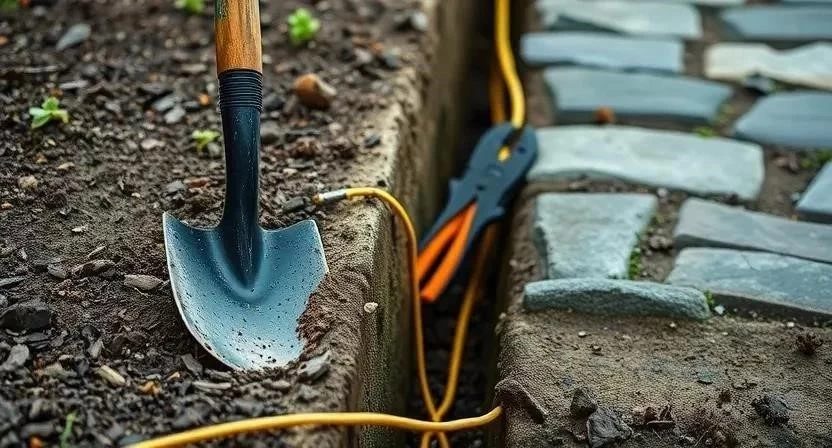 - Прокладка кабеля: Если используются сетевые светильники, необходимо проложить кабель в траншеях.