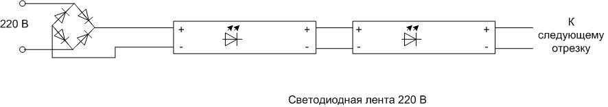 Самый тривиальный вариант – применение ленты, рассчитанной на полное напряжение сети. Однако напрямую подсоединять светильник к бытовой сети крайне нежелательно. Хотя светоизлучающие элементы обладают односторонней проводимостью и светятся во время положительной полуволны синусоиды, во время отрицательной к ним прикладывается напряжение обратной полярности. Светодиоды не рассчитаны на работу в качестве высоковольтных выпрямителей, поэтому обратное напряжение для них будет слишком велико, а время жизни элементов — мало. Включать LED-ленту в работу следует через выпрямитель – лучше через собранный по мостовой (двухполупериодной схеме).