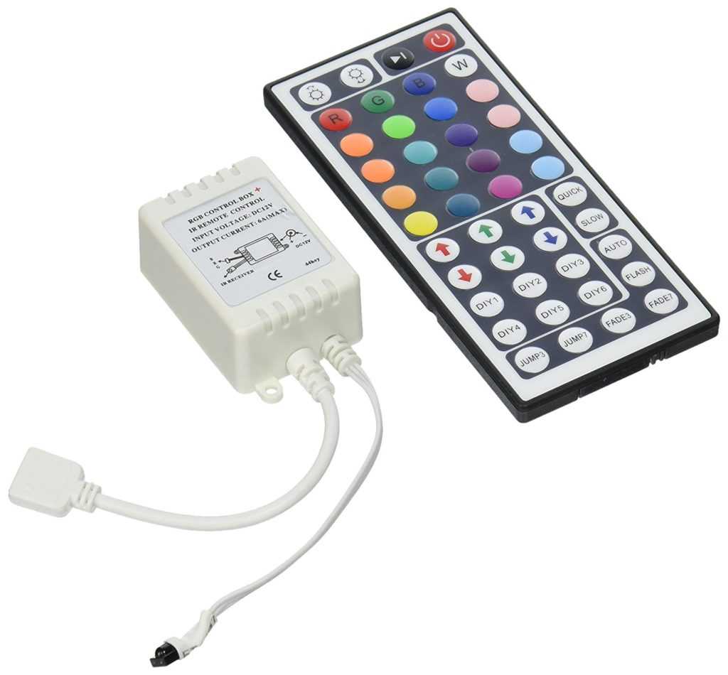 RGB-ленты, как правило, имеют такую опцию, как диммер. Элемент представляет собой специальный пульт управления, с помощью которого пользователь может изменять мощность освещения, а также настраивать цветопередачу.