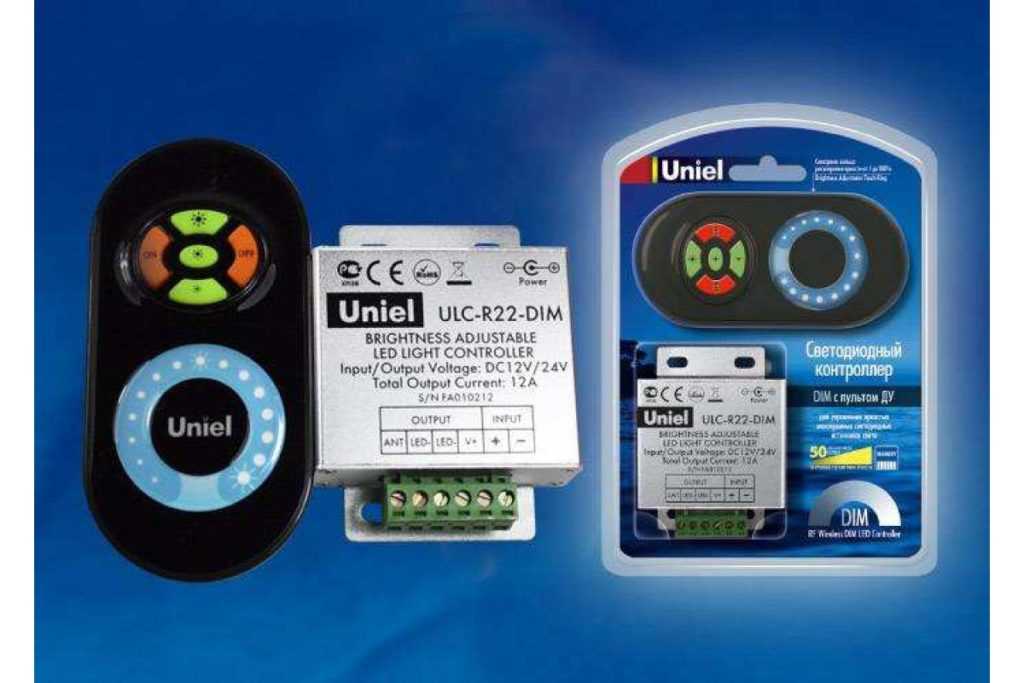 Неплохая модель сенсорного регулятора, на дистанционном пульте расположено сенсорное кольцо для осуществления все нужных манипуляции. В диммер встроена функция памяти, сохраняющая все настройки в случае внезапного выключения прибора. Для тог чтобы прибор работал без перебоев в его плату встроена специальная защита от радиочастотных помех. Качественные детали увеличивают срок эксплуатации до 50000 часов. У Uniel ULC-R22-DIM предусмотрена комбинированная подача напряжения, то есть оно может быть и 12, и 24 В.